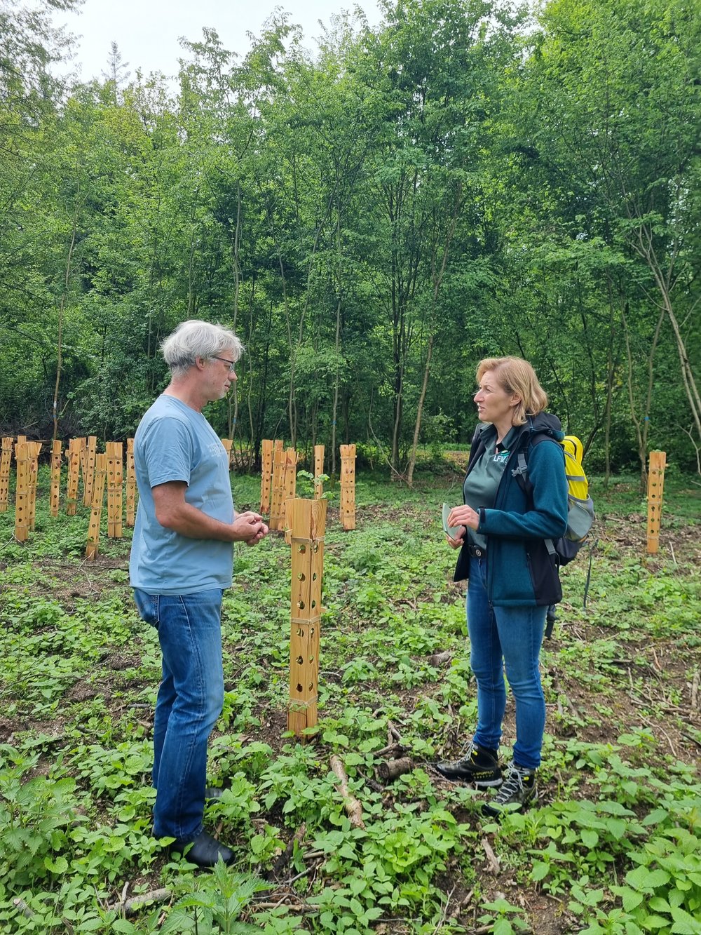 An mehreren Standorten zeigten uns Frau Anselment und Herr Himmel Durchforstungsprojekte zur Schaffung weiterer Mischwaldflächen. Ziel für die Zukunft müsse es sein, Bäume anzusiedeln, die sich noch besser an den Klimawandel anpassen können, so Himmel. Aus diesem Grund gibt es Überlegungen, drei Teilflächen durch wissenschaftliche Untersuchungen näher betrachten zu lassen, z.B. im Rahmen von Bachelor- bzw. Masterarbeiten, um z.B. genauer zu betrachten, wie sich eine geringere Pflege auf die Widerstandsfähigkeit des Waldes auswirkt. Auch wurde uns die praktische Umsetzung des Alt- und Totholzkonzeptes gezeigt. Das Gemeinderatsmitglied Volker Stelzer hat für mehr Totholz und das Stehenlassen von höheren, abgestorbenen Baumstämmen plädiert, um so Nist- und Schlafhöhlen für Spechte und Fledermäuse zu bieten.