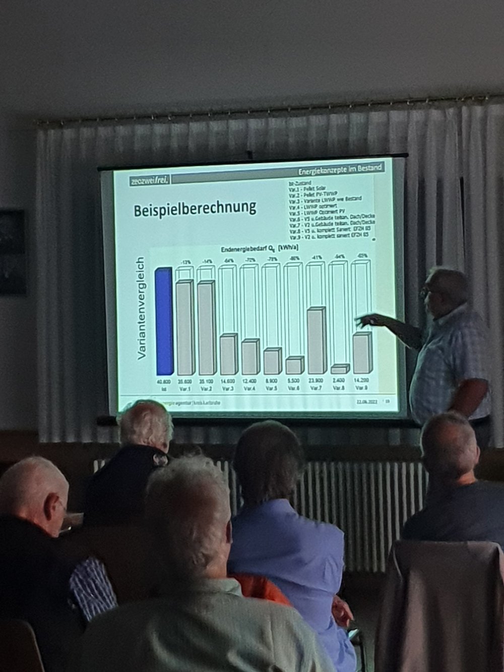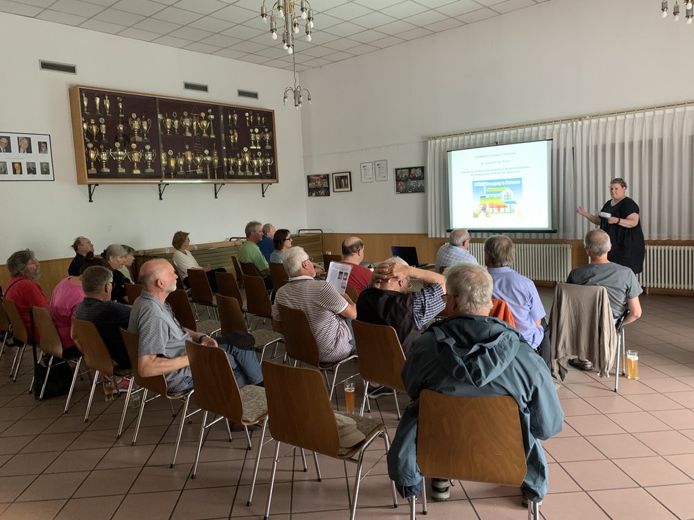 Der Abschluss wurde von Kathrin Weisser eingeführt und moderiert und fand im Sängerheim statt, wo der Energieberater Matthias Haas, als Berater aus dem Energieberater-Netzwerk der Umwelt- und Energieagentur Kreis Karlsruhe (UEA), einen Vortrag „Möglichkeiten und Grenzen der klimagerechten Heizungsumrüstung im Altbau“ hielt. Hierbei präsentierte er zum einen theoretische Grundlagen und zum anderen praktische Beispiele für Energie- und Kostenberechnungen. Den Kern bildete die Darstellung, anhand eines normalen Altbaus neun technische Varianten zu betrachten, welche Kosten diese verursachen, welche Einsparungen dadurch erfolgen können und welche Effekte sie für den Klimaschutz haben. Neben den unterschiedlichen Heizungstypen wurde dabei auch auf unterschiedliche Sanierungstiefen eingegangen. Es wurde aufgezeigt, dass sich für das Beispielobjekt die Installation einer Luft-Wasser-Wärmepumpe, optimiert mit PV und einer ganzheitlichen Gebäudesanierung auf einen Effizienzhausstandard insgesamt am klimafreundlichsten darstellt. An den Kommentaren, den Diskussionsbeiträgen und den Fragen war zu erkennen, dass Herr Haas mit seiner Darstellung den Kern des Interesses getroffen hat. Auch nach dem Ende der Veranstaltung entspannen sich bei Brezeln und Getränken angeregte Diskussionen unter den Teilnehmenden. Wir sind sicher, dass einige Anregungen mitgenommen werden konnten, und hoffen, dass demnächst weitere Gebäude in Stutensee klimagerecht saniert werden.