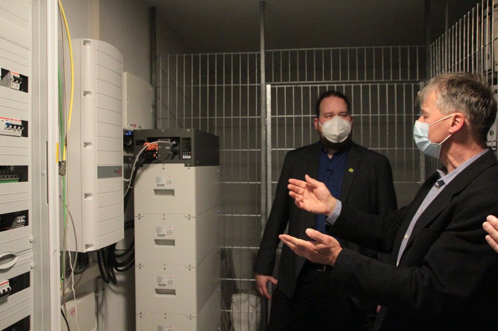 Christoph Maier zeigt im Keller von Heinz Maier, wie wenig Platzbedarf für diese neue und sehr ertragreiche Anlage mit einem 24 kWh Batteriespeicher notwendig ist, die sich problemlos an einer Wand aufstellen lässt.