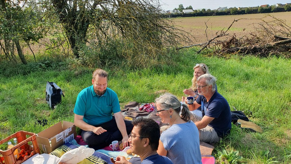 Anschließend fand sich die Gruppe zum Picknick im Grünen ein. Wir tauschten uns über Maßnahmen zur Verbesserung der Artenvielfalt und unsere Kritik an der Landwirtschaftspolitik der Bundesregierung aus. Es wäre so einfach: Änderung der EU-Subventionen für die Landwirtschaft, so dass nicht die Fläche nach dem Gießkannenprinzip vor allem an die industrielle Landwirtschaft bezahlt wird. Statt dessen könnten mit einer gezielten Förderung vor allem Bio-Landwirtschaftsbetriebe oder zumindest kleinere regionale Betriebe mit reduziertem Pestizideinsatz unterstützt werden.