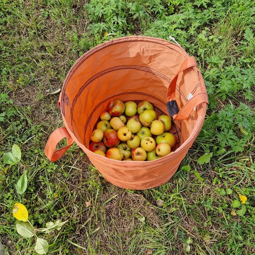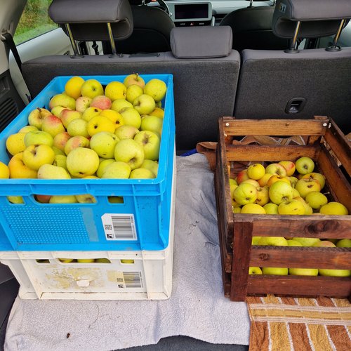 am vergangenen Samstag haben wir begonnen, die Äpfel auf unserer Streuobstwiese in Blankenloch Nord zu ernten. Für die Qualität ist es erforderlich, dass die Äpfel gepflückt und nicht geschüttelt werden. 54 kg konnten wir bereits ernten und nach Unteröwisheim zur Kelterei bringen. Aus den Äpfeln wird Bio-Streuobst-Apfelsaft hergestellt.