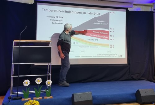 Am 22. September standen das Rathaus Waghäusel und seine Außenanlagen ganz im Zeichen des Klimaschutzes. Eingeladen waren alle Interessierten unter dem Motto: „Energiewende in Aktion“. Auch eine Delegation der Stutenseer Grünen besuchte die Veranstaltung. Vorgestellt wurden z.B. E-Fahrzeuge aller Art, Klimaschutzprojekte der Schulen und der Stadt. Dazu gab es eine ganze Reihe von Vorträgen und Filmen, z.B. zu den "neuesten Entwicklungen bei den Wärmepumpen", zu "Fernwärmeversorgung und staatliche Zuschüsse" oder zum "Mythos Technologieoffenheit". Von Dr. Volker Stelzer wurde dargelegt, dass durch Klimaschutzmaßnahmen nicht nur Katastrophen verringert werden, sondern dass für viele Menschen solche Maßnahmen zu einem besseres Leben beitragen können. Der Höhepunkt war dann der Vortrag der Fernsehmoderatorin Claudia Kleinert, die noch einmal sehr genau darlegte, wie wir Menschen dazu beitragen, das Klima in eine Richtung zu verändern, die für viele Menschen und Regionen zu katastrophalen Zuständen führt.