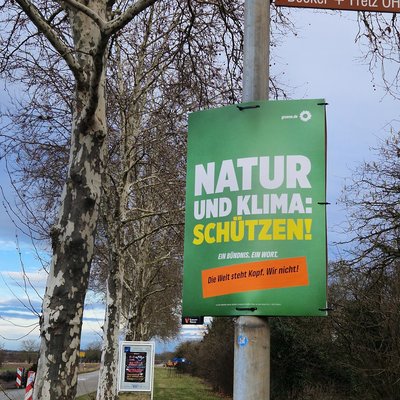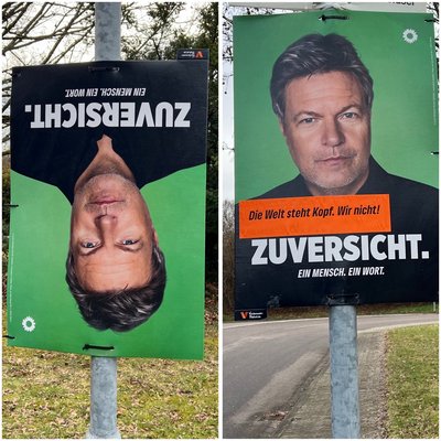 In Stutensee hatte der Grüne Ortsverband bewusst die Wahlplakate falsch herum aufgehängt. Nun werden sie wieder aufrecht hingehängt verbunden mit einem Aufruf zur Zuversicht inmitten einer turbulenten globalen Lage. Mit dem Störer „Die Welt steht Kopf. Wir nicht!" sollen die Plakate dies ausdrücken.